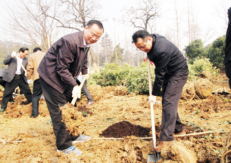 上午10時許,一到植樹現(xiàn)場,周春雨、白金明、何金良、顧世平、方志宏等市幾大班子領(lǐng)導就迅速融入到植樹勞動的大軍之中。他們興致勃勃地拿起鐵鍬,同在場的干部一起揮鍬挖土,將一棵棵樹苗植入樹坑,培土,澆灌,每道工序都做得十分認真。市委書記周春雨、市長白金明一邊植樹,一邊與市林業(yè)局、住建委負責同志交談,了解全市植樹造林及“綠滿珠城”工作開展情況。經(jīng)過一番緊張勞動,300多棵桂花、櫻花等樹木昂然挺立,在和煦的春光中綻放蓬勃生機。